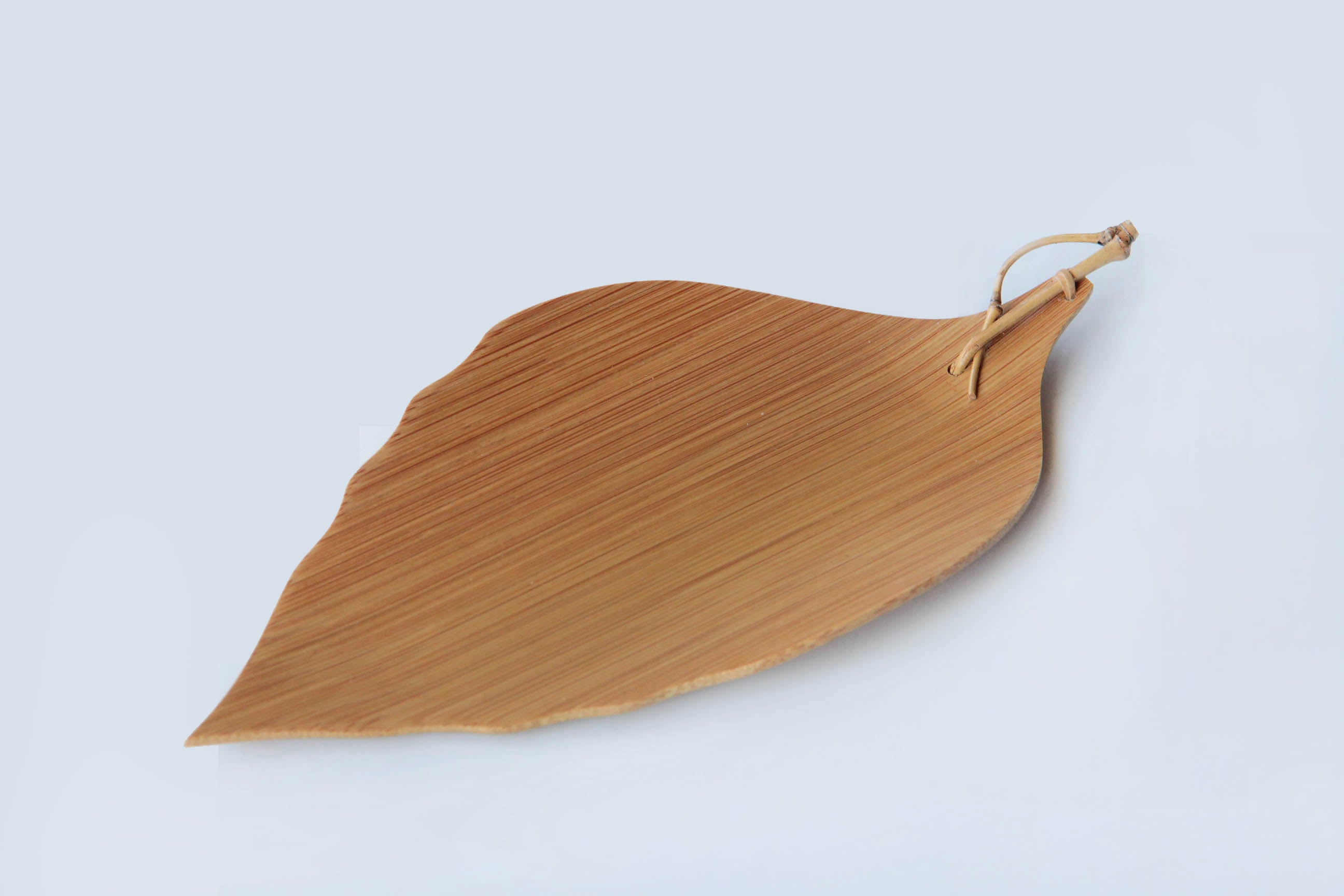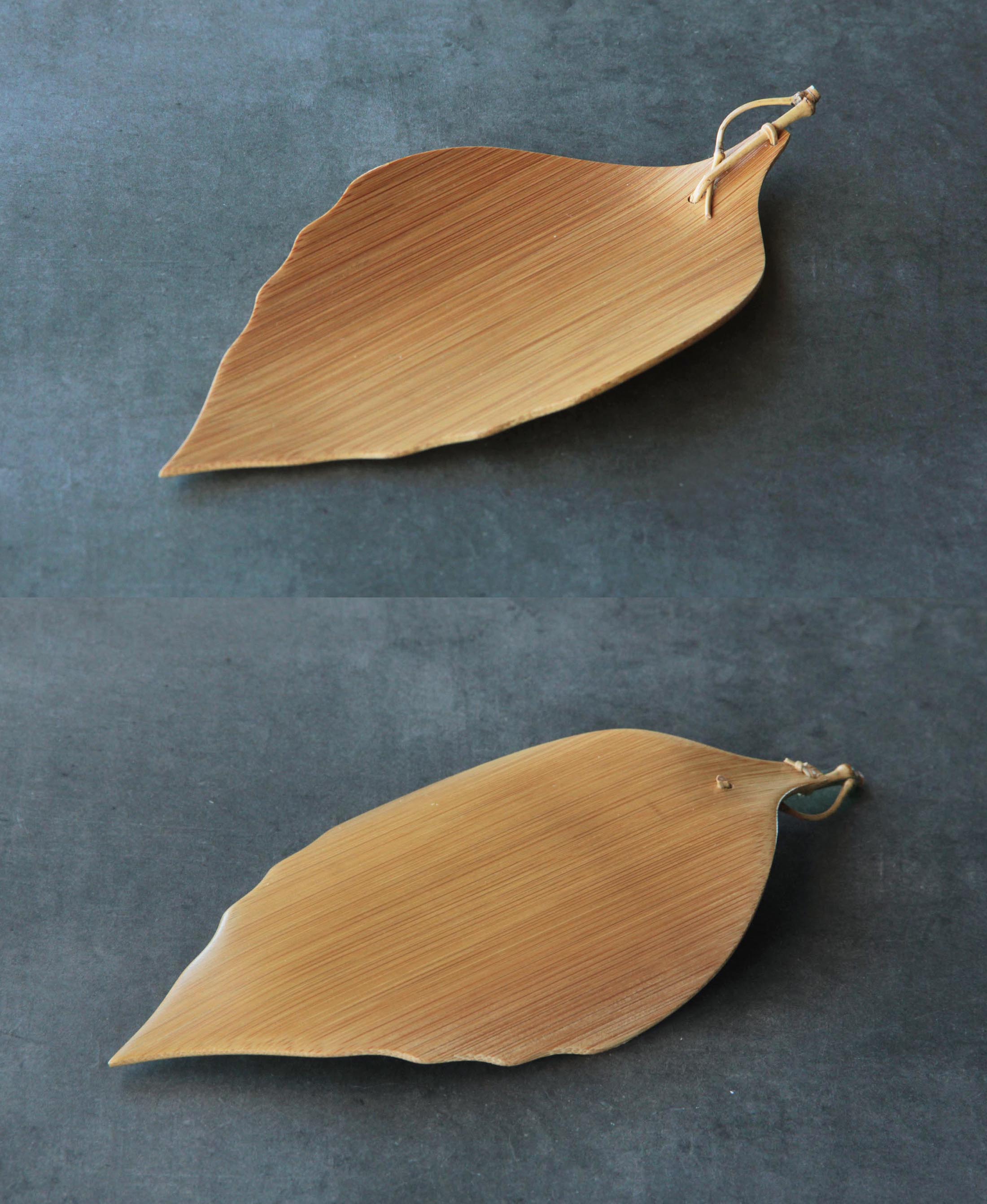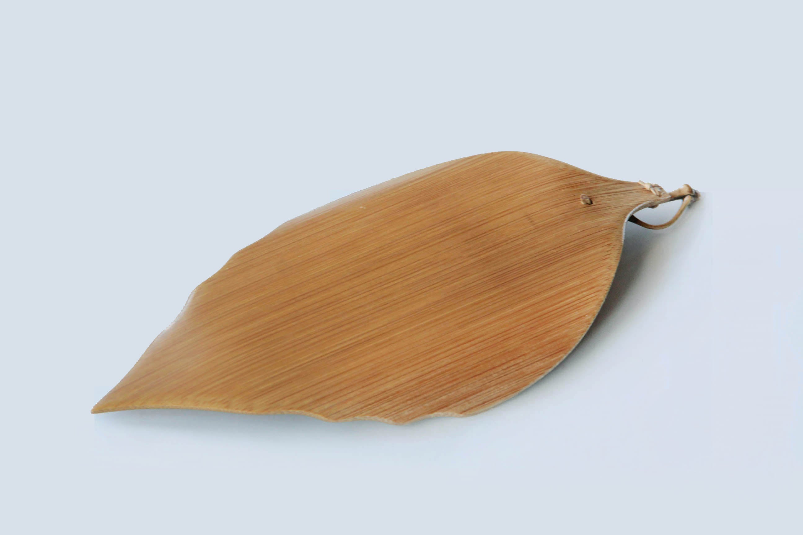 A small, hand-crafted bamboo plate in the shape of a leaf.