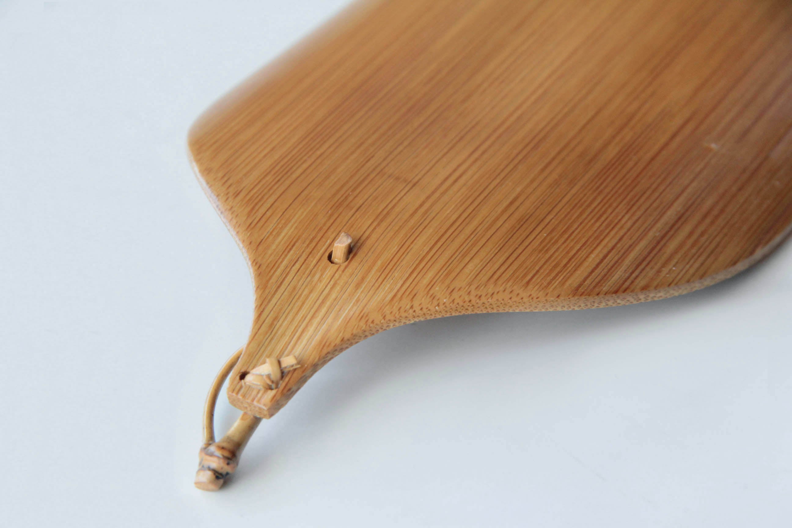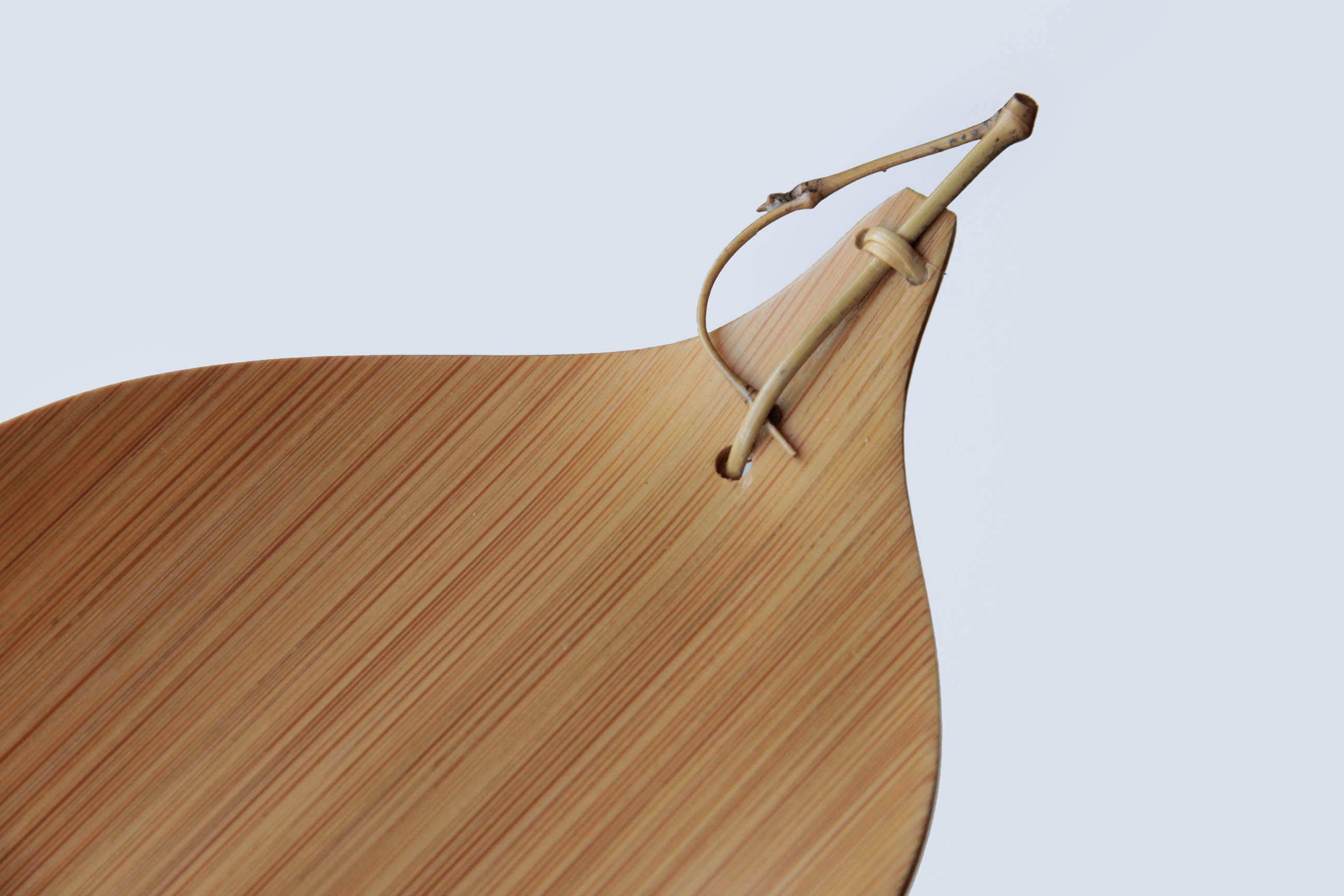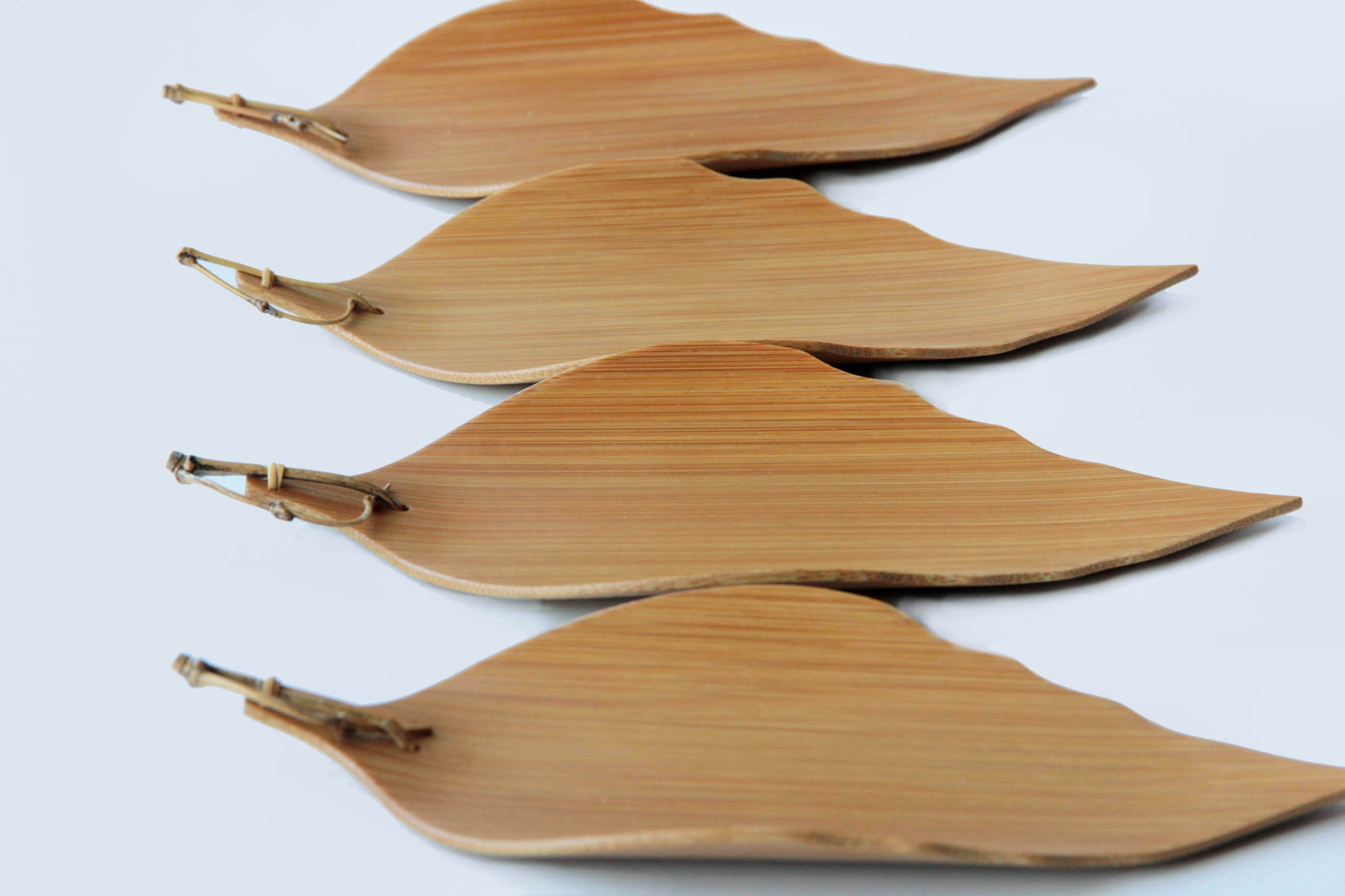 A small, hand-crafted bamboo plate in the shape of a leaf.