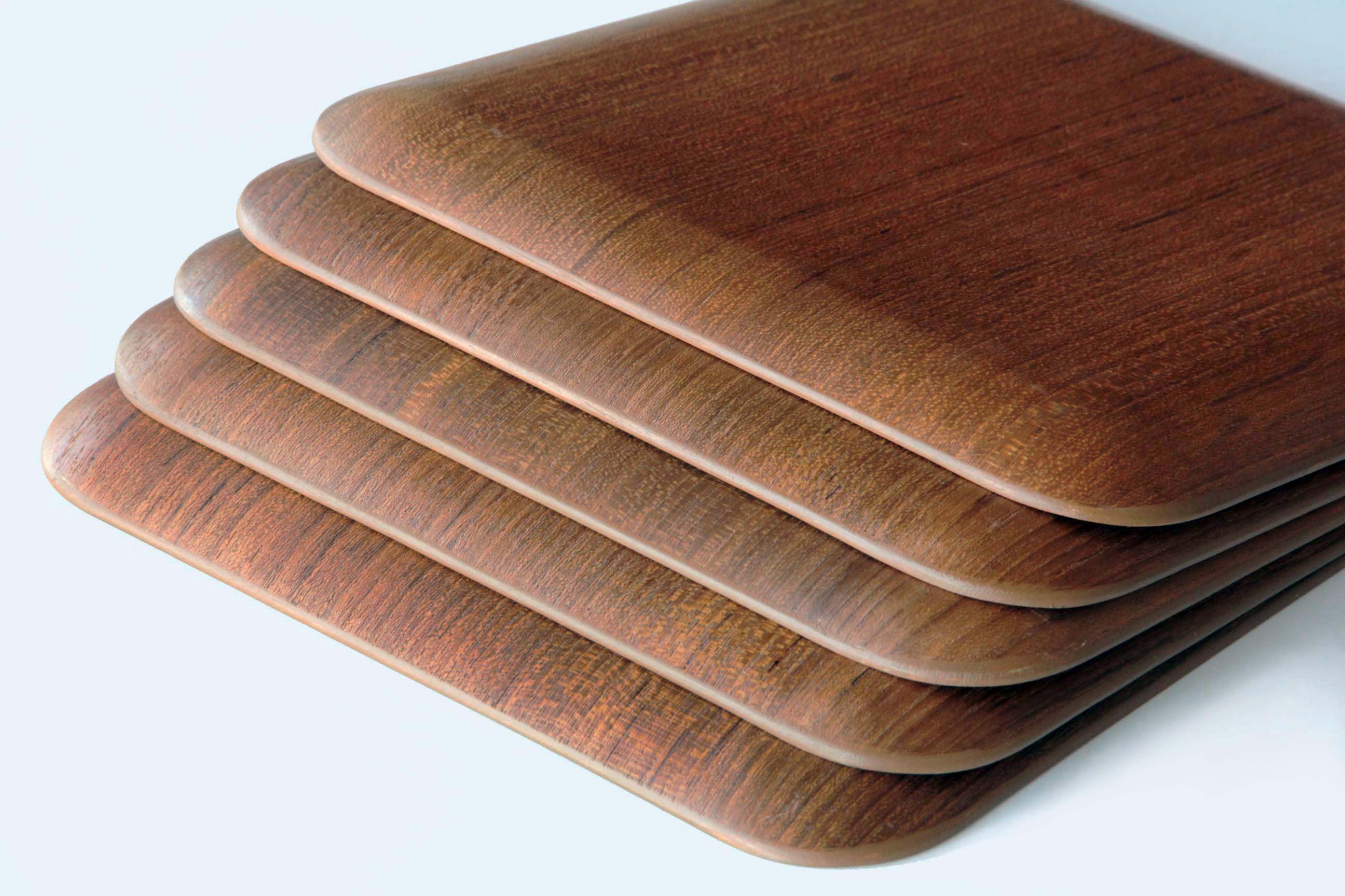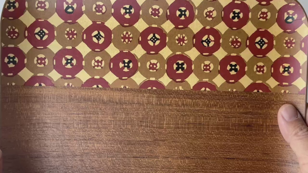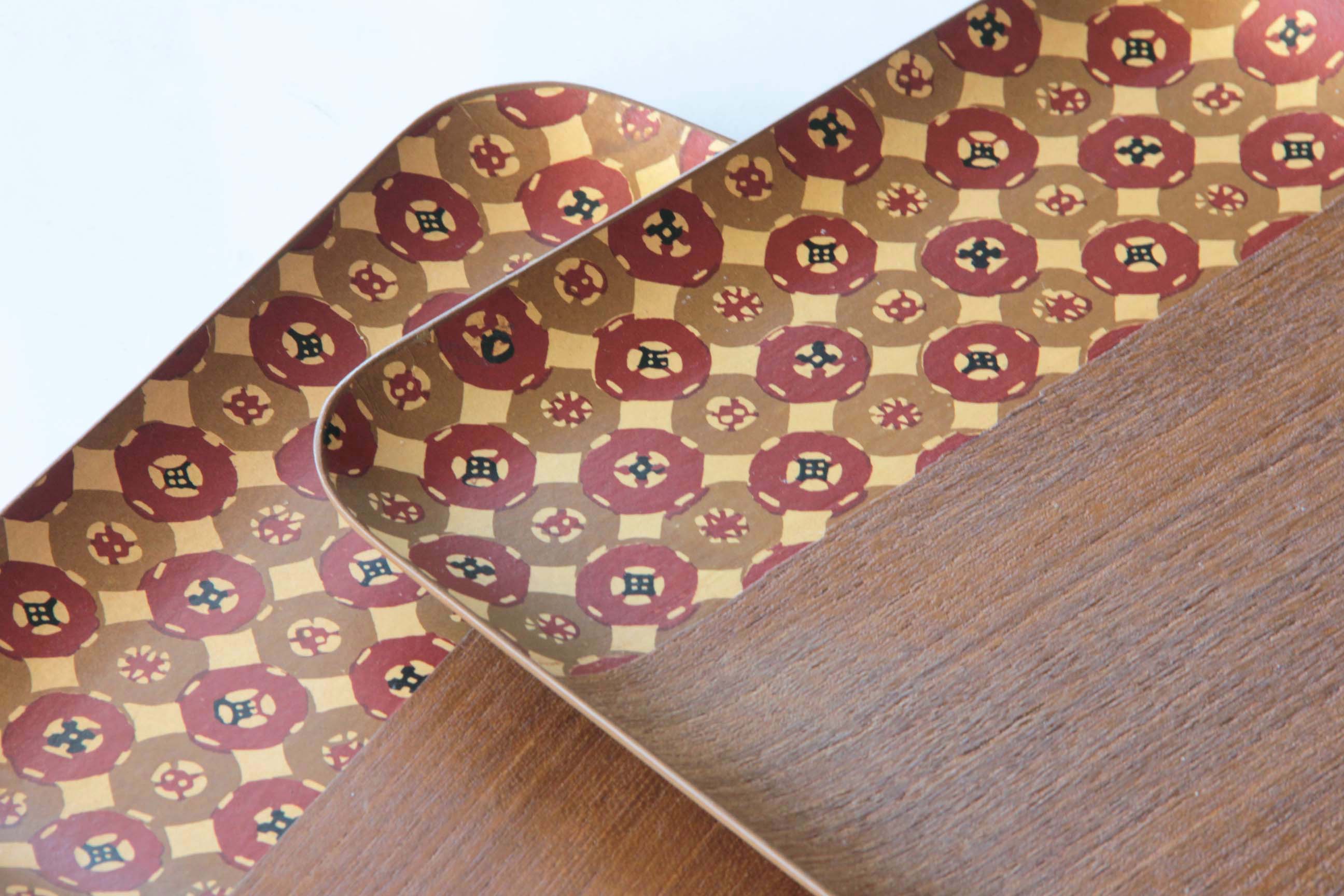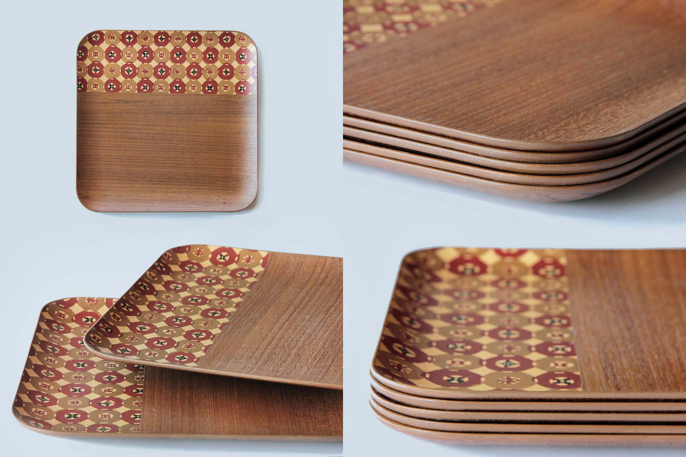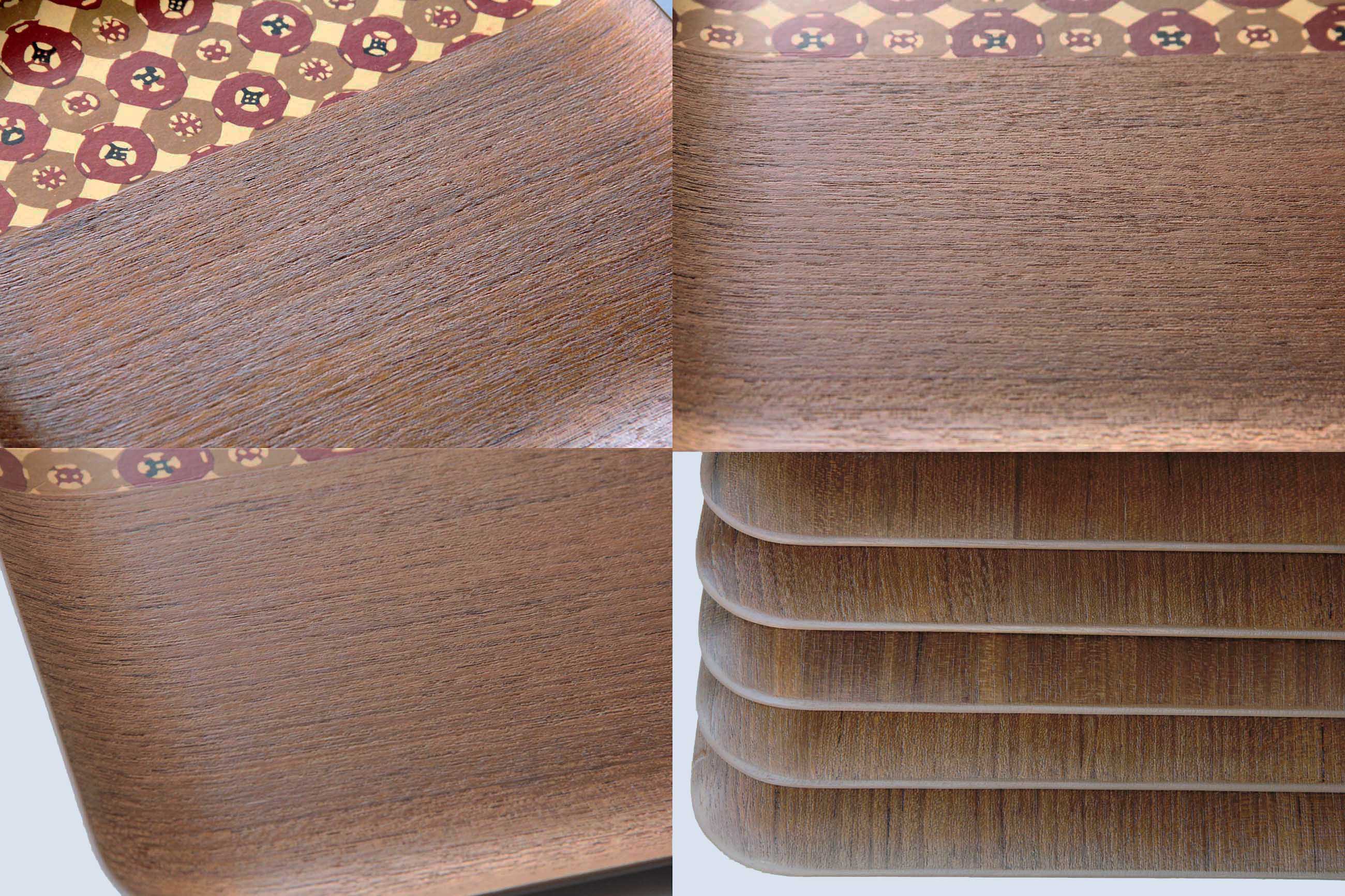 Wooden tray featuring a thin, elegant construction and a traditional Japanese decorative pattern along the inner surface.