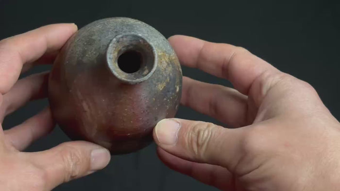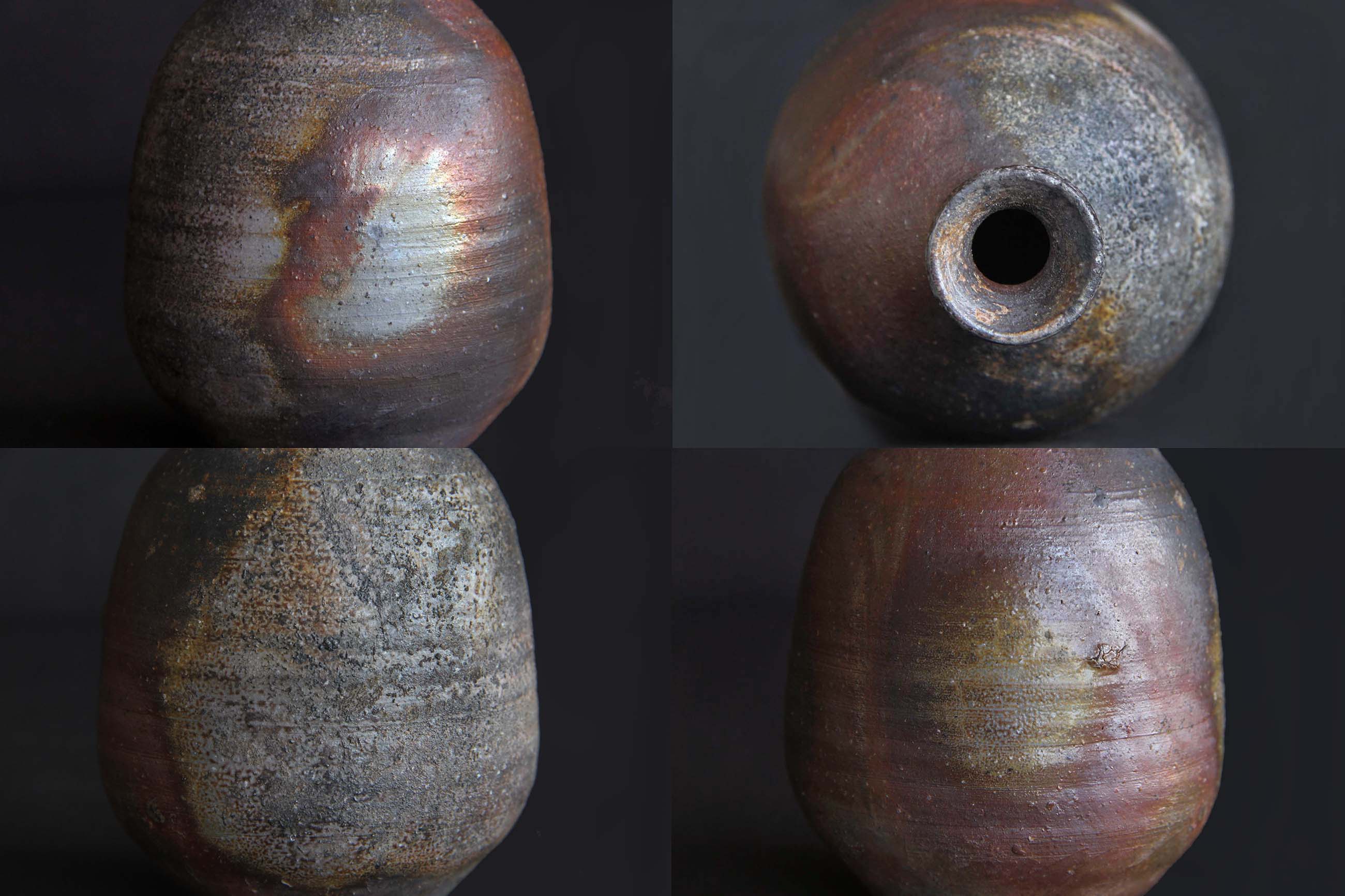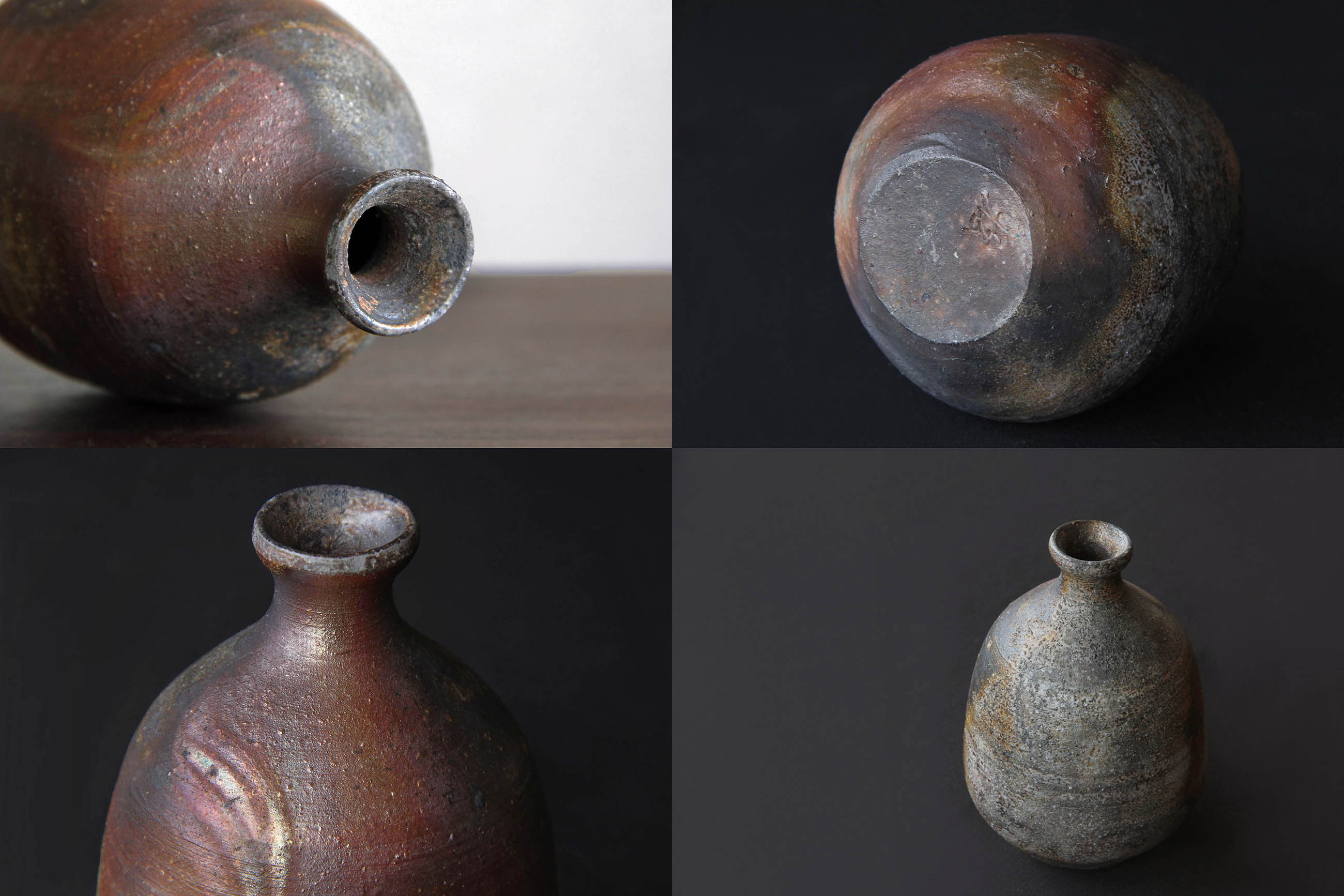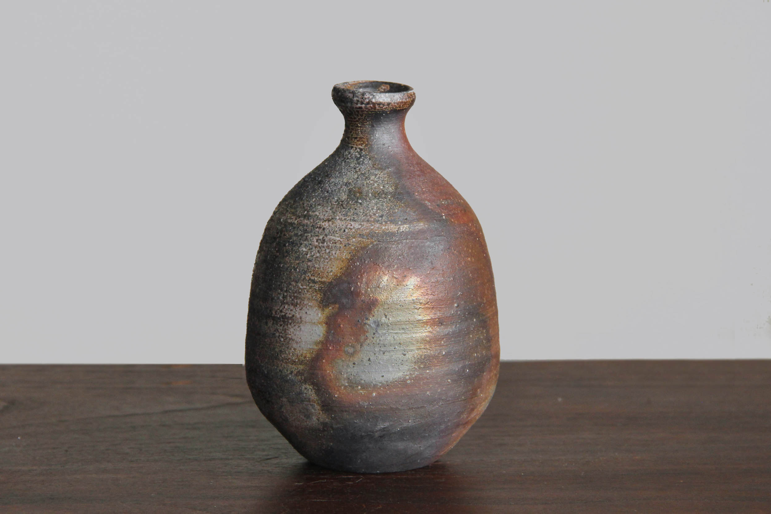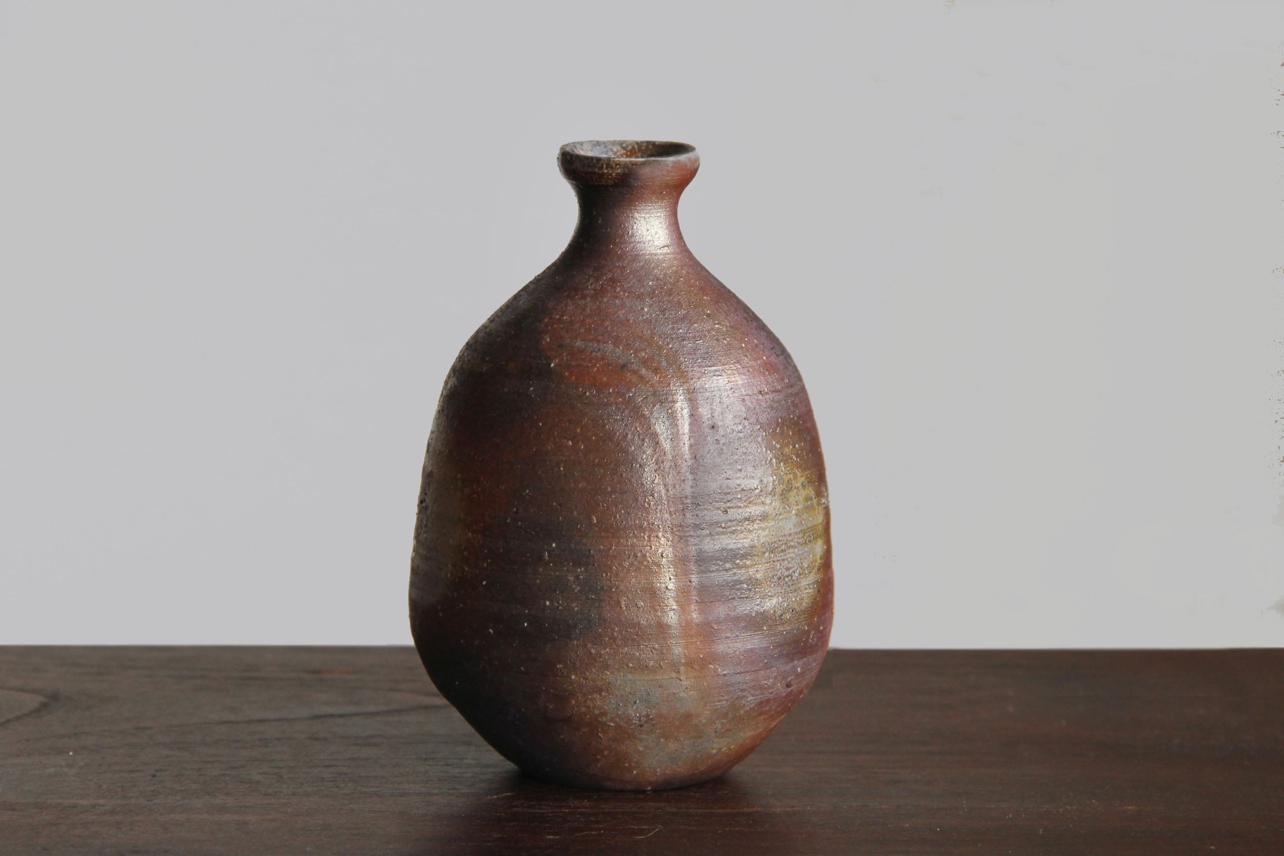 This Bizen ware bottle was fired in a wood-burning kiln without the use of any glaze. The natural character of the clay appears directly on the surface, with kiln effects created by flame and ash spreading across the entire body. The gradual transition in color from olive-tinged brown to deeper earthy brown results from the vessel’s placement in the kiln and variations in temperature during firing, and cannot be intentionally reproduced.