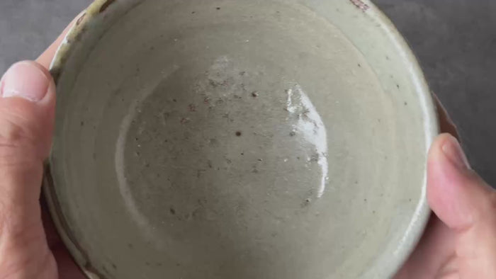 This Japanese tea bowl features a warm amber glazes that flow vertically down the faceted body.