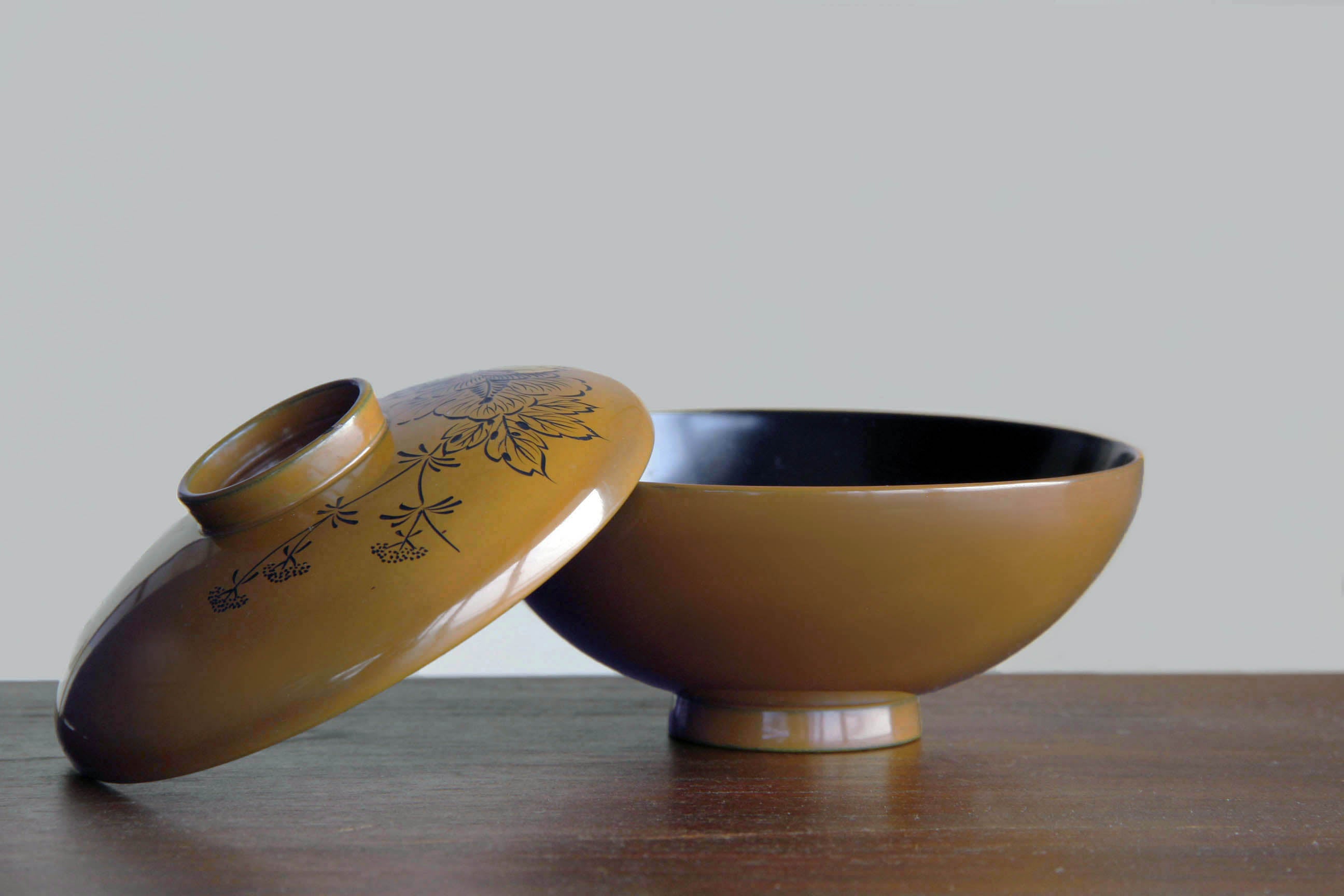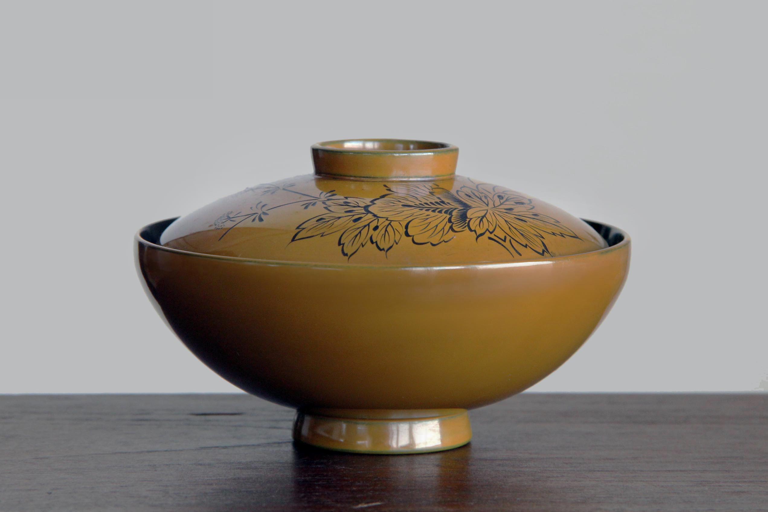 A Japanese urushi lacquer lidded bowl finished in a warm amber-tone.