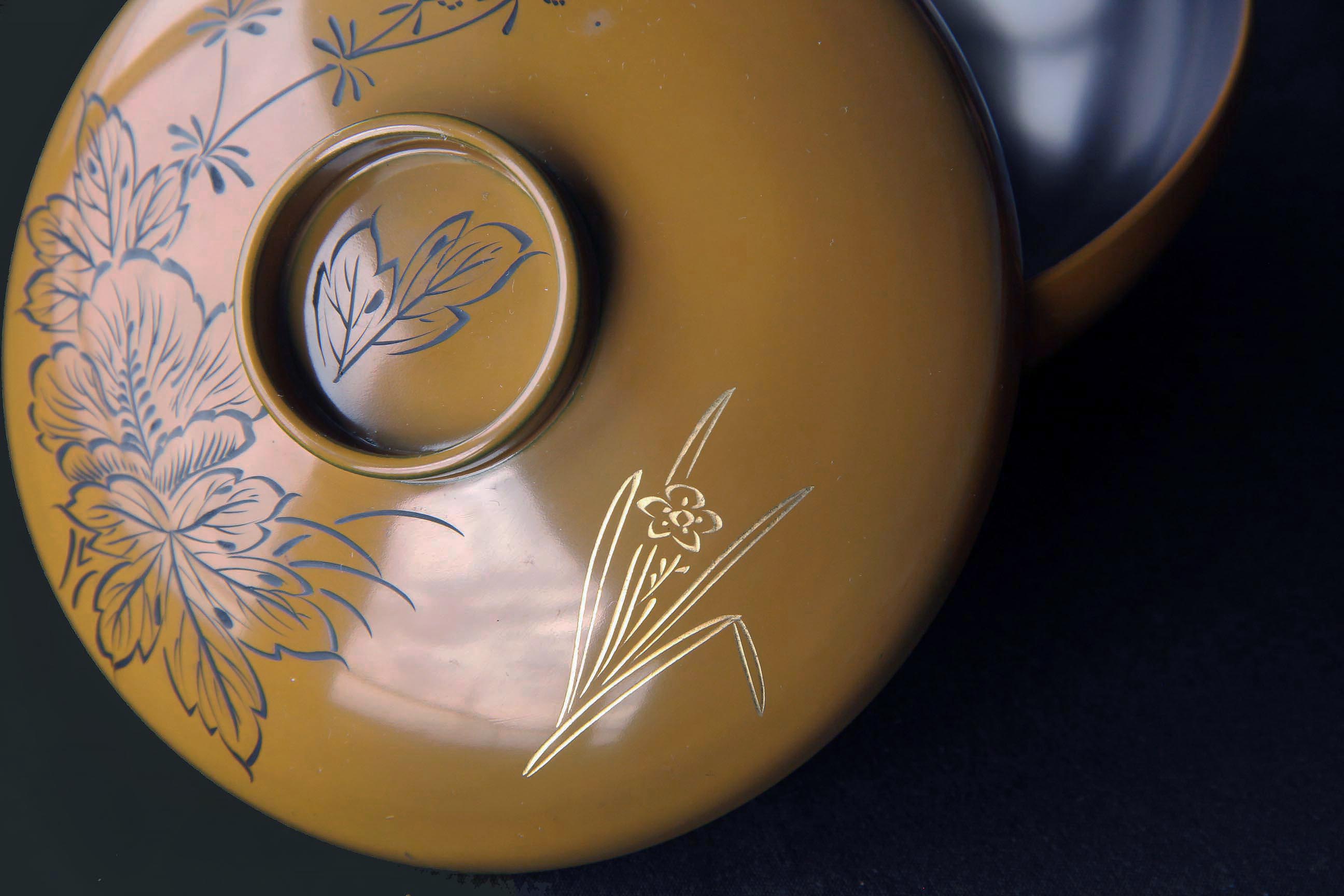 Chinkin : designs are carved into the lacquer surface, and gold powder is applied into the grooves.