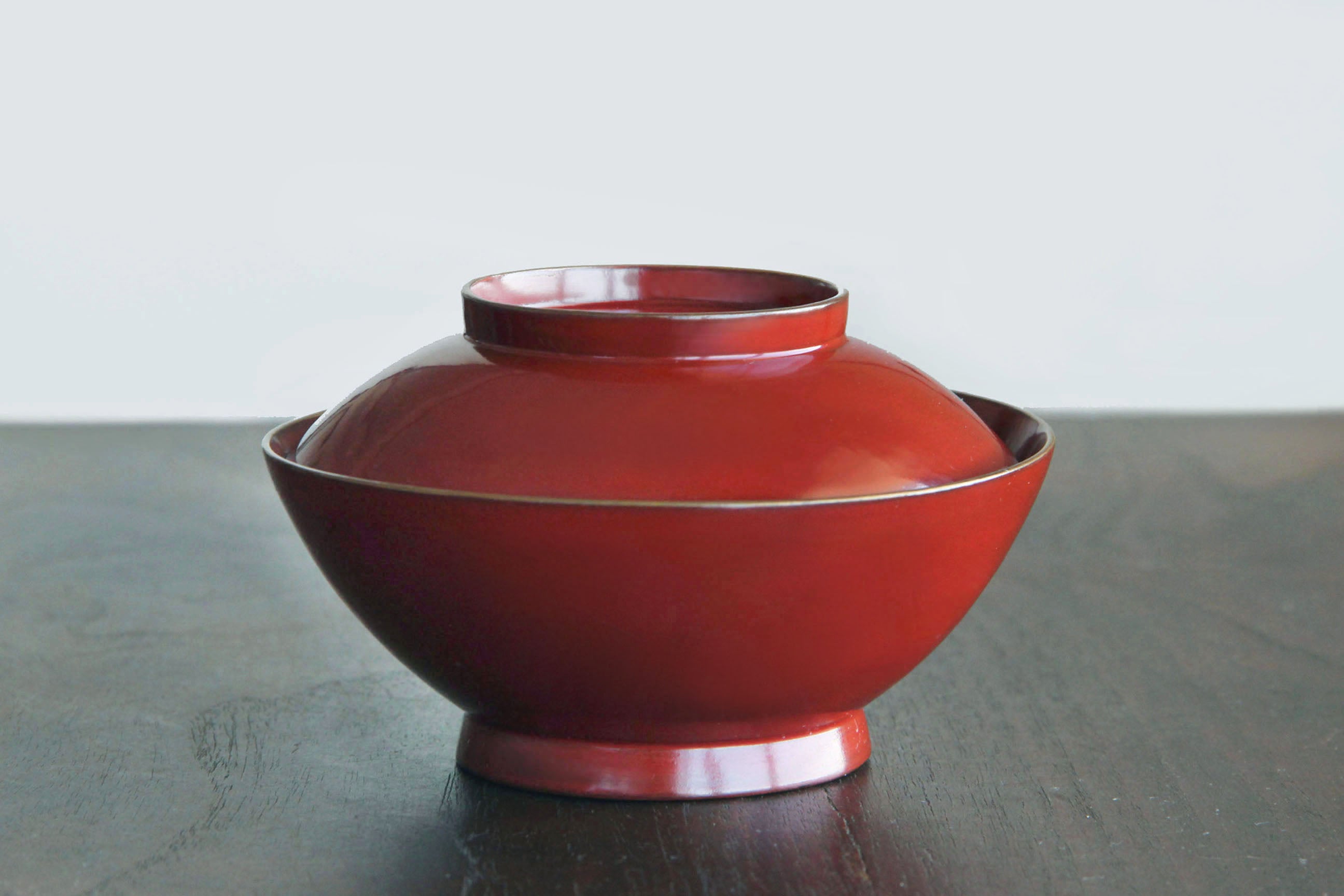 A refined antique owan finished in deep vermilion urushi lacquer. The form is gently rounded, with a balanced silhouette and a low, stable foot. The surface shows a smooth, even gloss that reflects light softly without harsh glare.