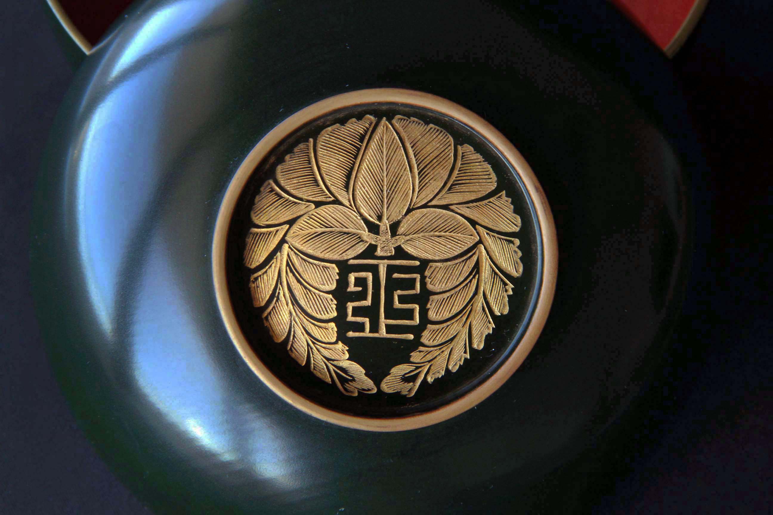 The gold decoration is created using the chinkin technique, in which the design is carefully carved and inlaid with gold.