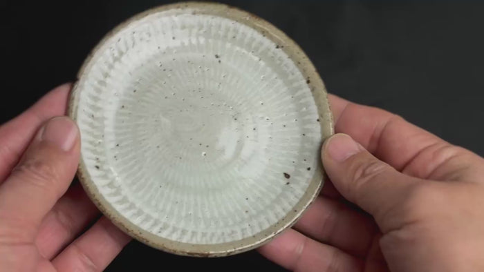 A small ceramic dish finished in a soft pale glaze with a subtle brush pattern applied to the interior in gentle radial strokes.