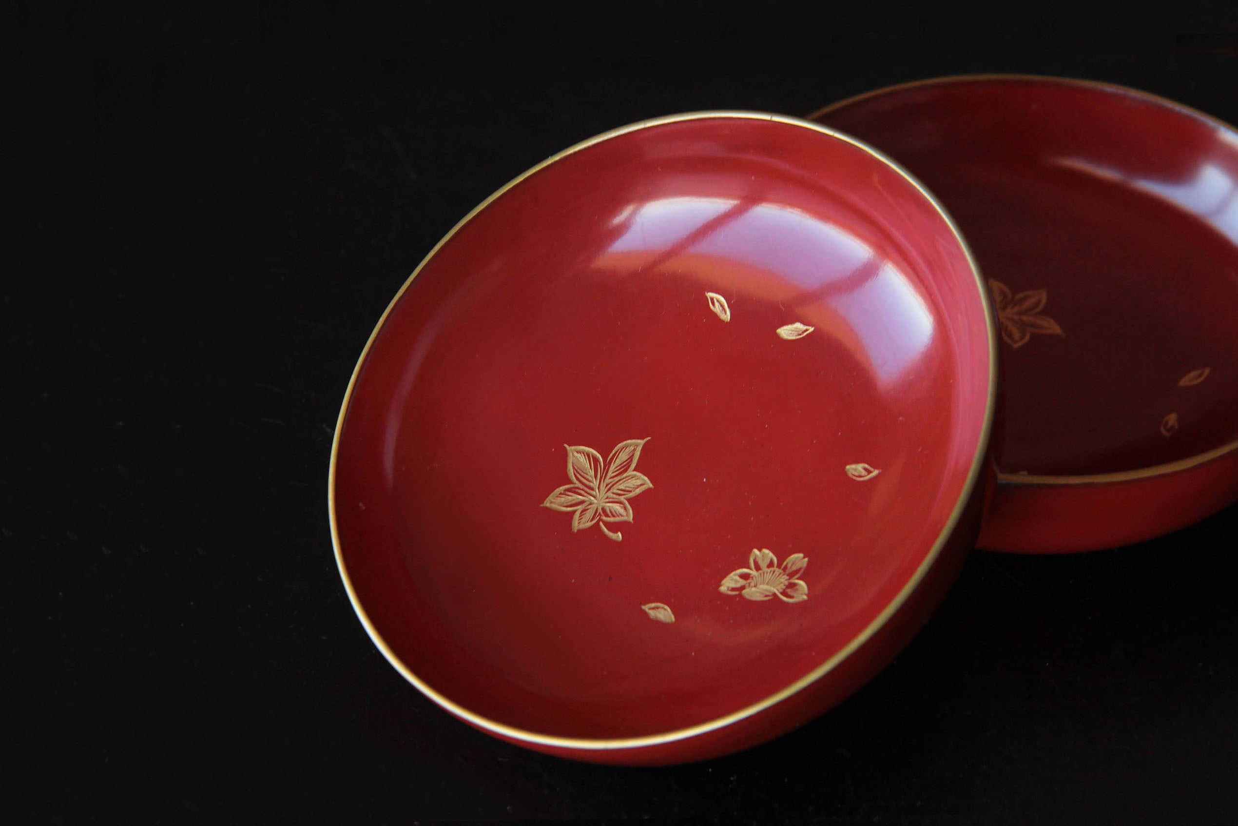 Chinkin : designs are carved into the lacquer surface, and gold powder is applied into the grooves.
