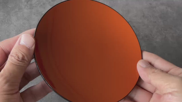 The front surface reveals a warm vermilion tone, while the reverse side shows an elegant contrast of glossy black.