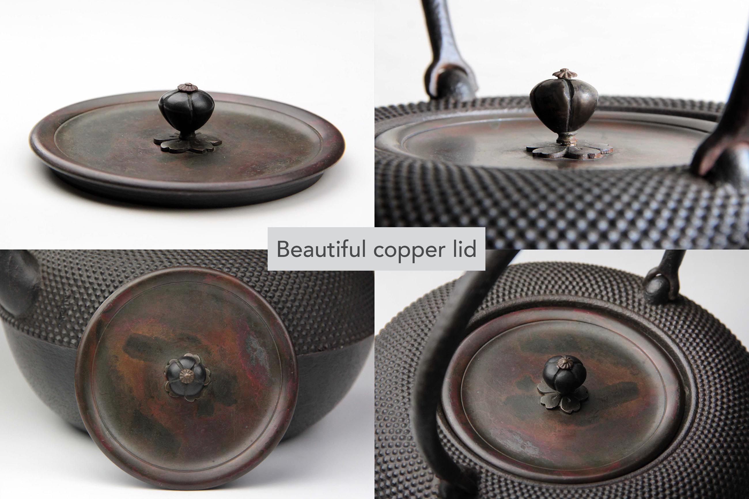 Stunning vintage Tetsubin kettle by Shojudo, featuring an elegant copper lid.