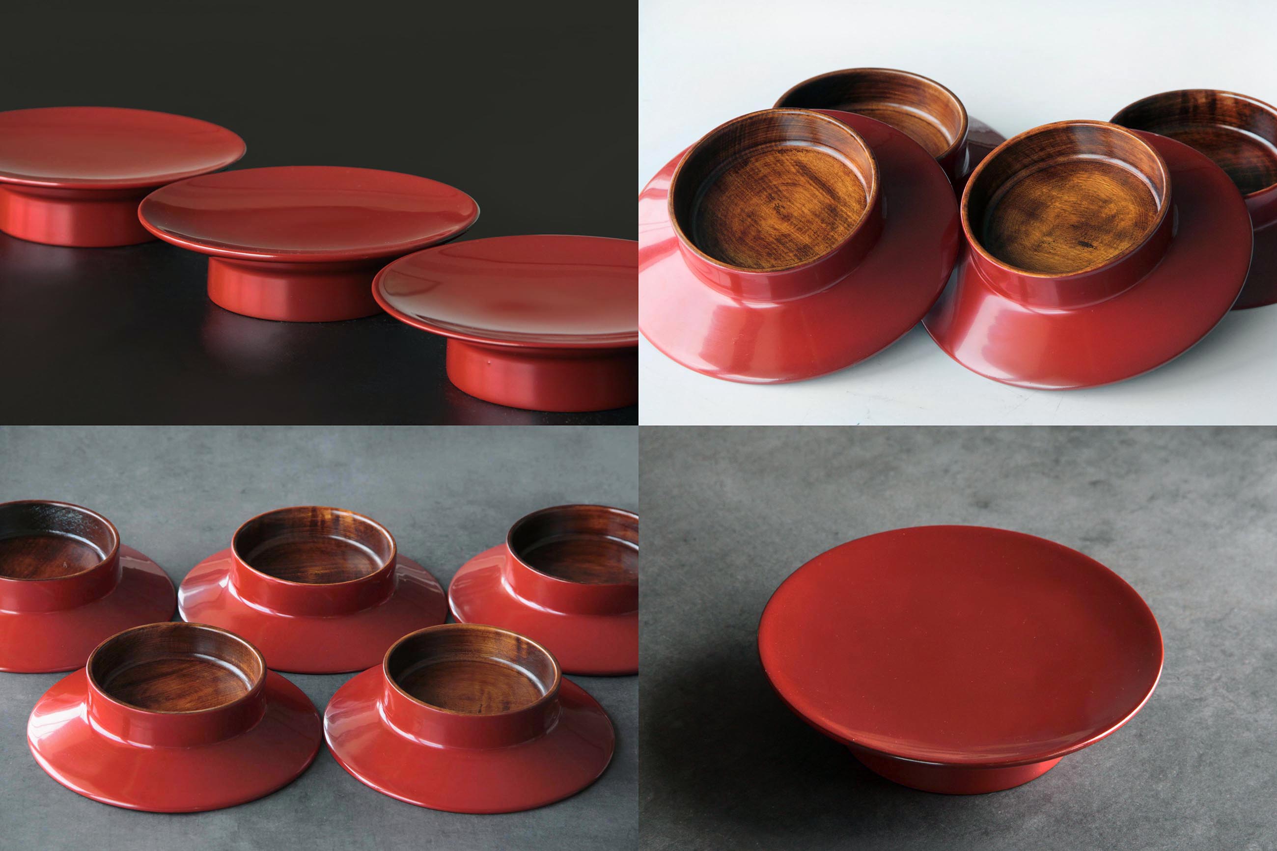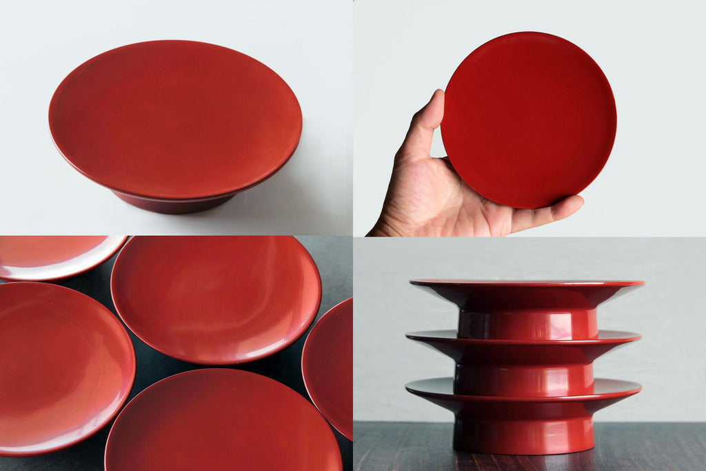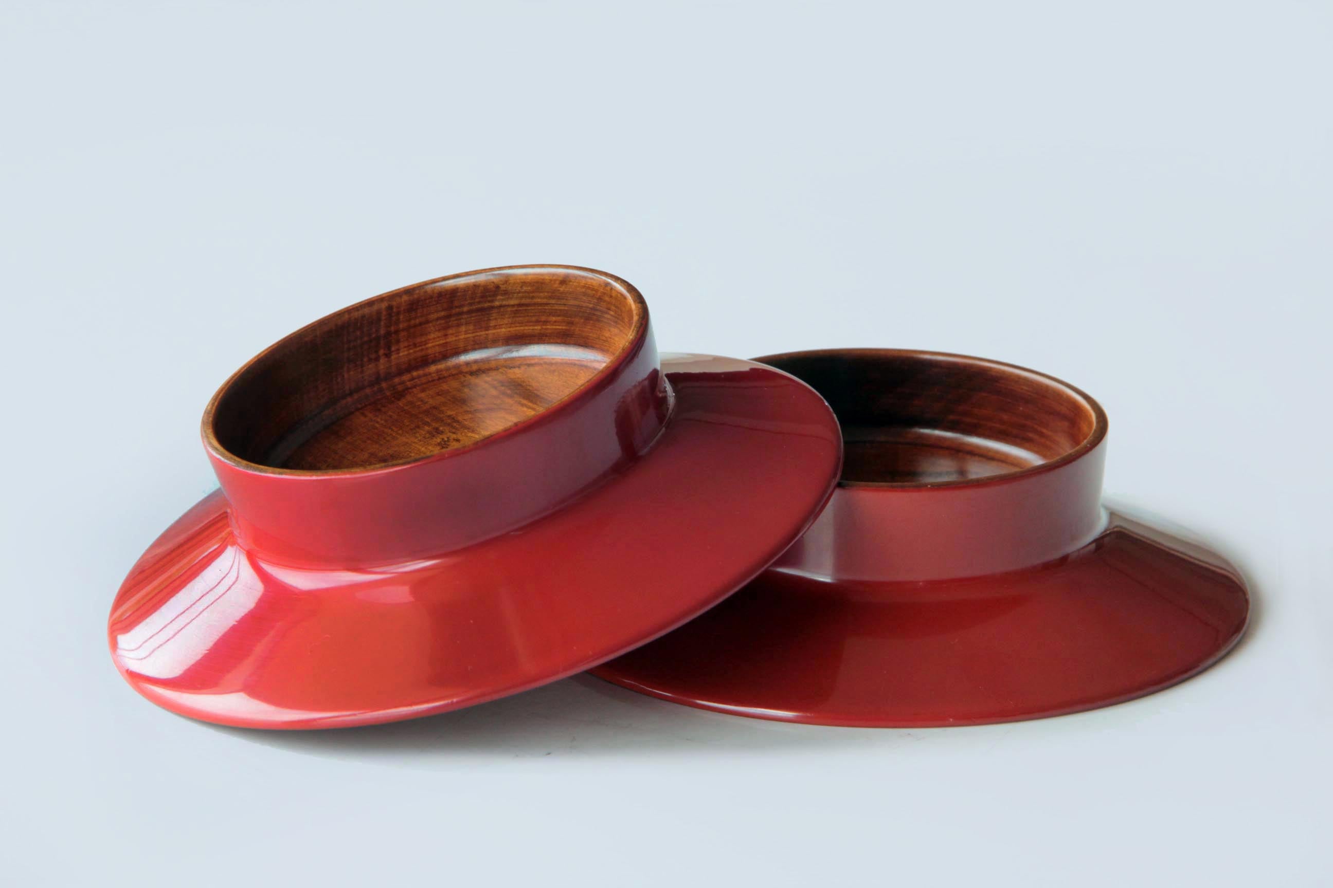 A refined Japanese wooden footed plate finished with Urushi lacquer in an elegant red tone.