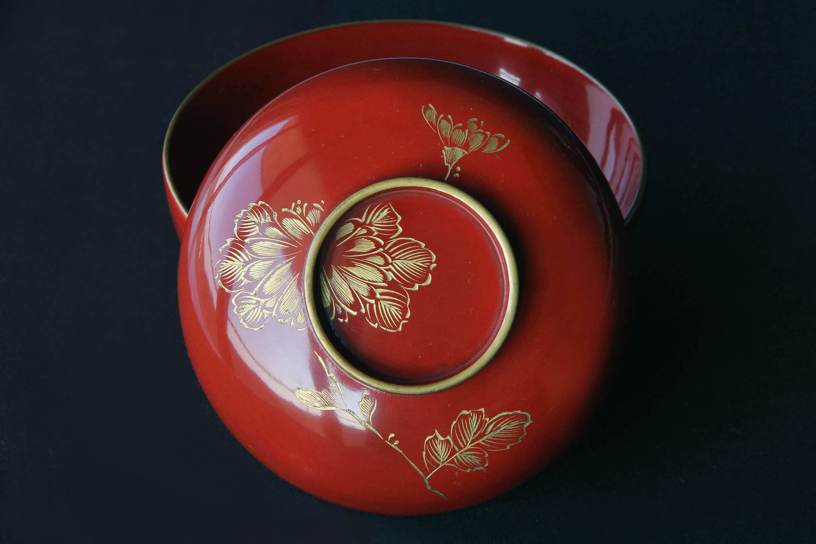 Chinkin : designs are carved into the lacquer surface, and gold powder is applied into the grooves.