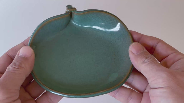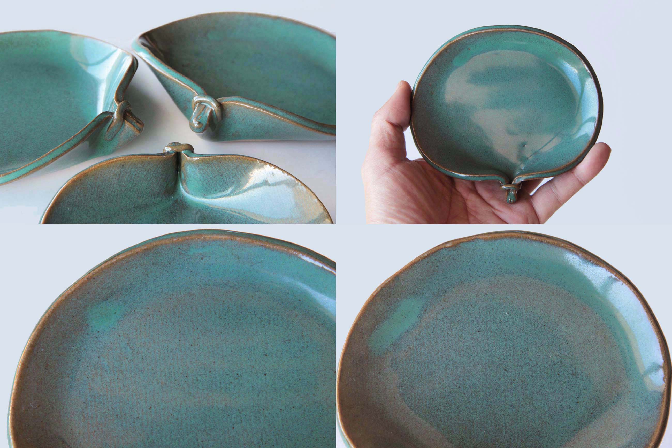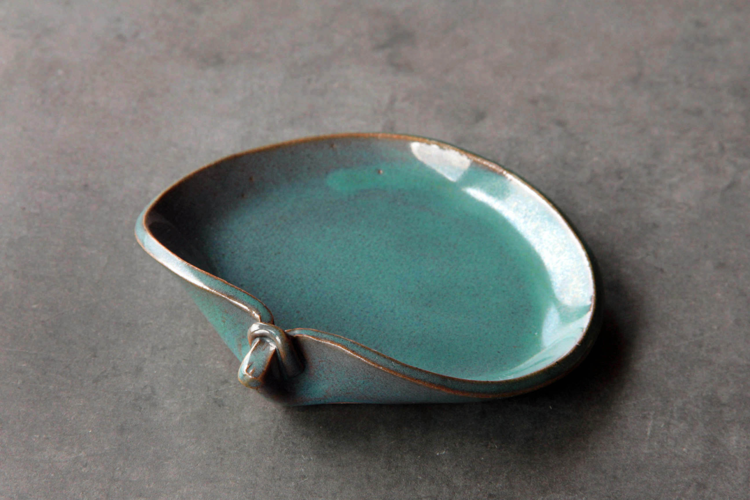 A handcrafted ceramic plate finished in a soft turquoise glaze, shaped with an organic rounded form and a gently folded rim that highlights the maker’s touch.