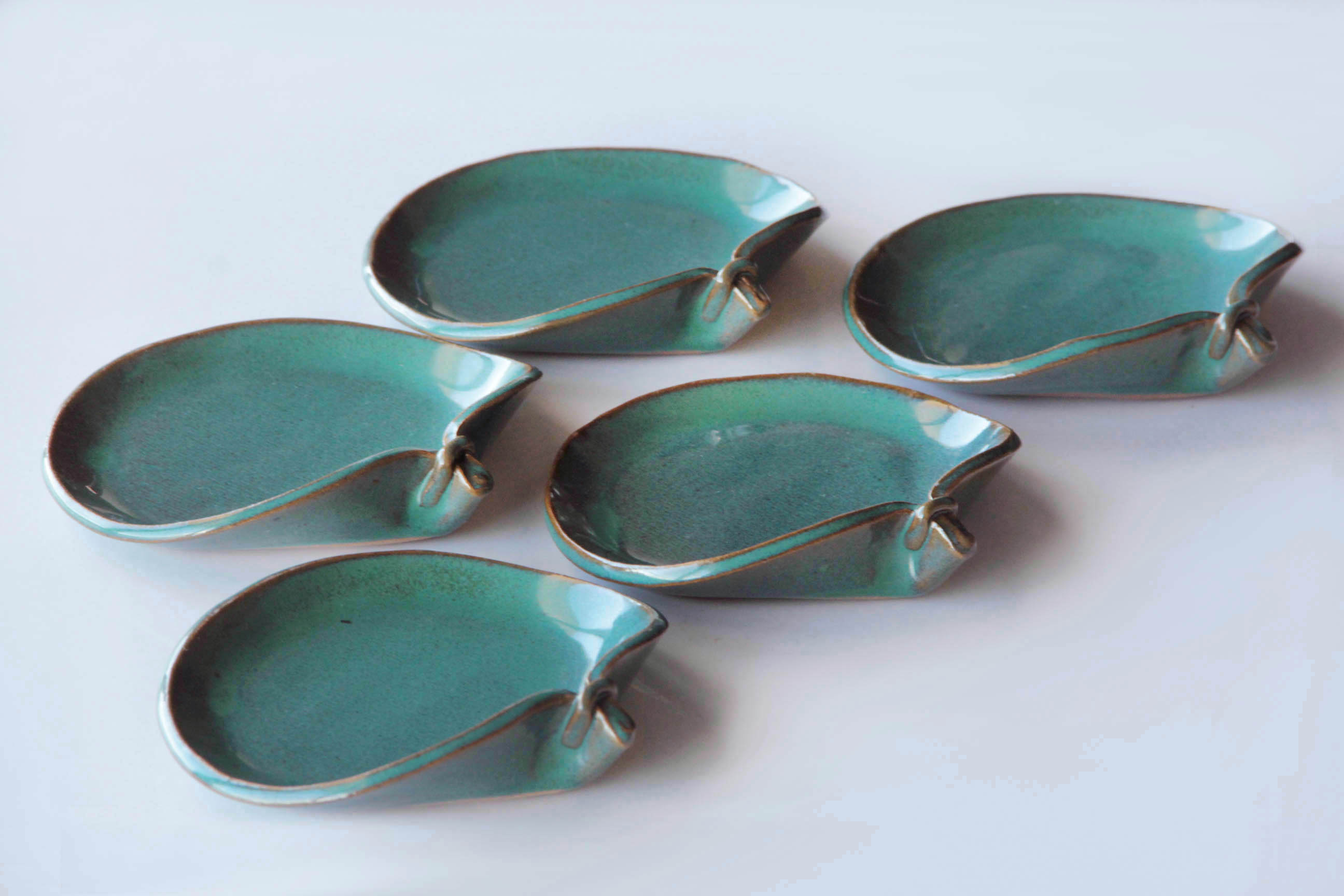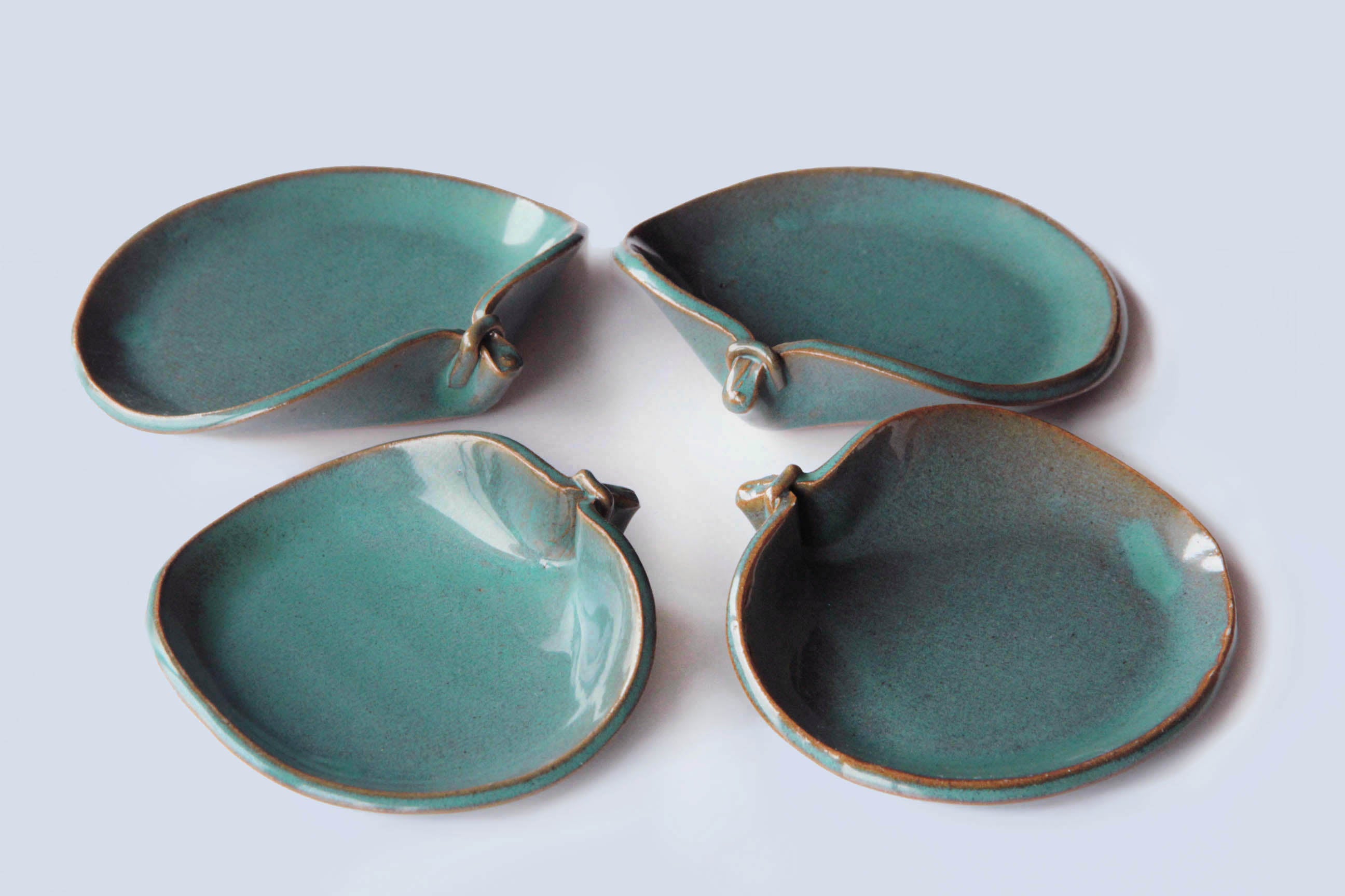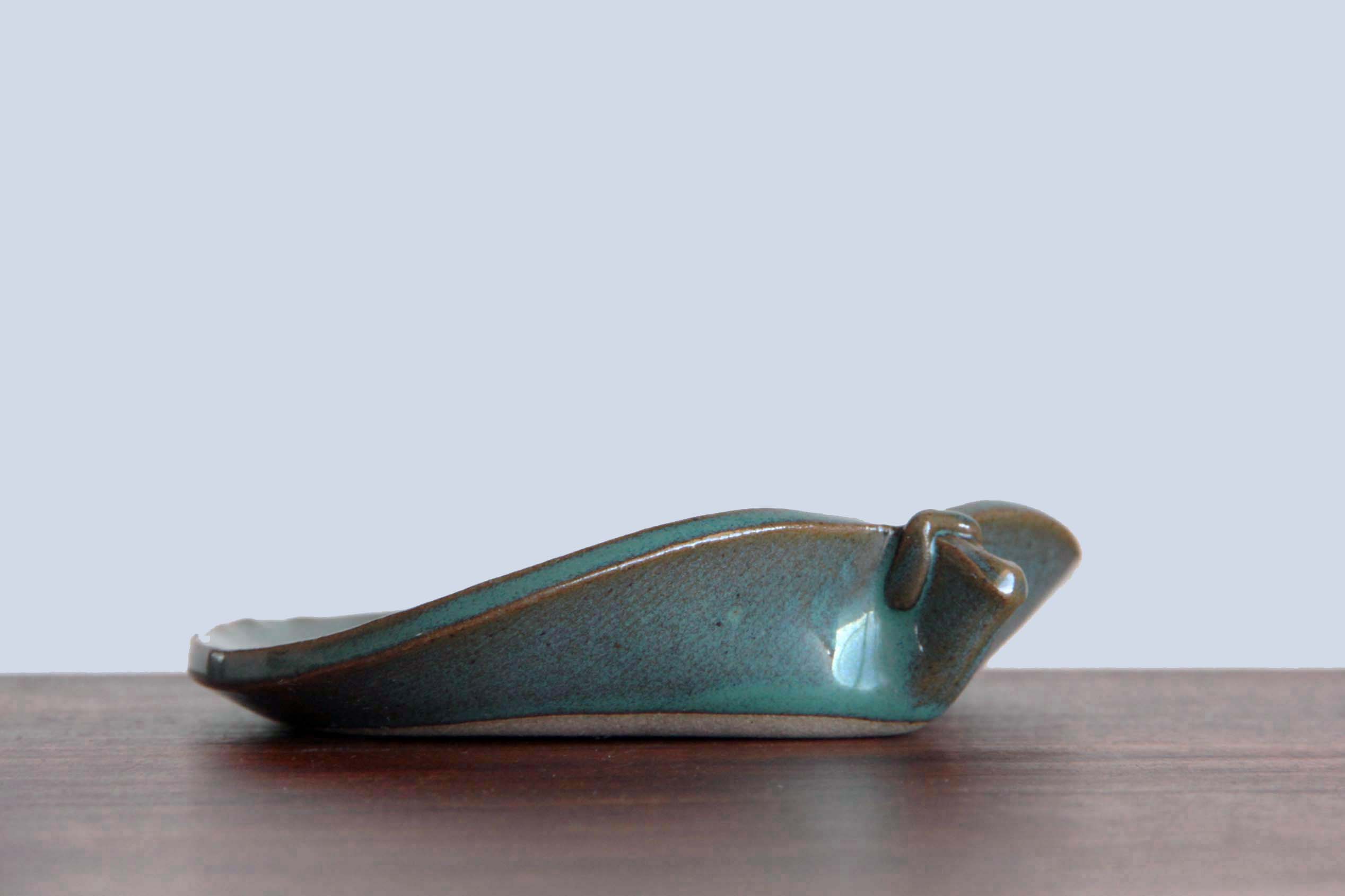 A handcrafted ceramic plate finished in a soft turquoise glaze, shaped with an organic rounded form and a gently folded rim that highlights the maker’s touch.