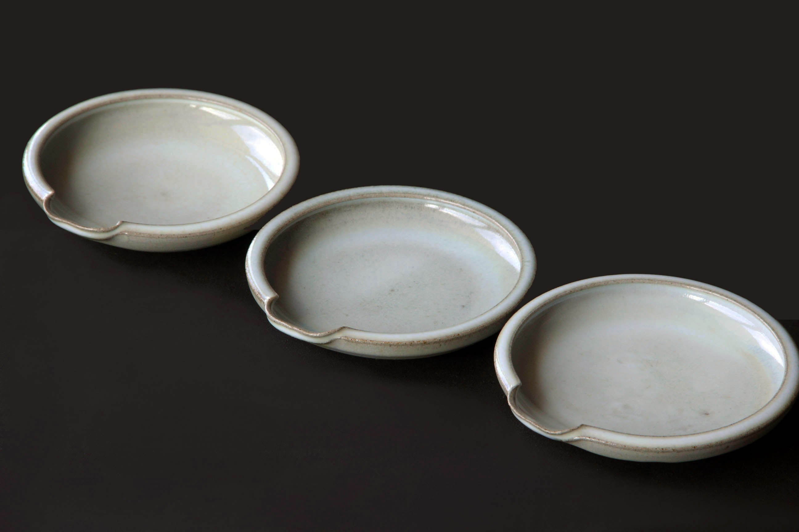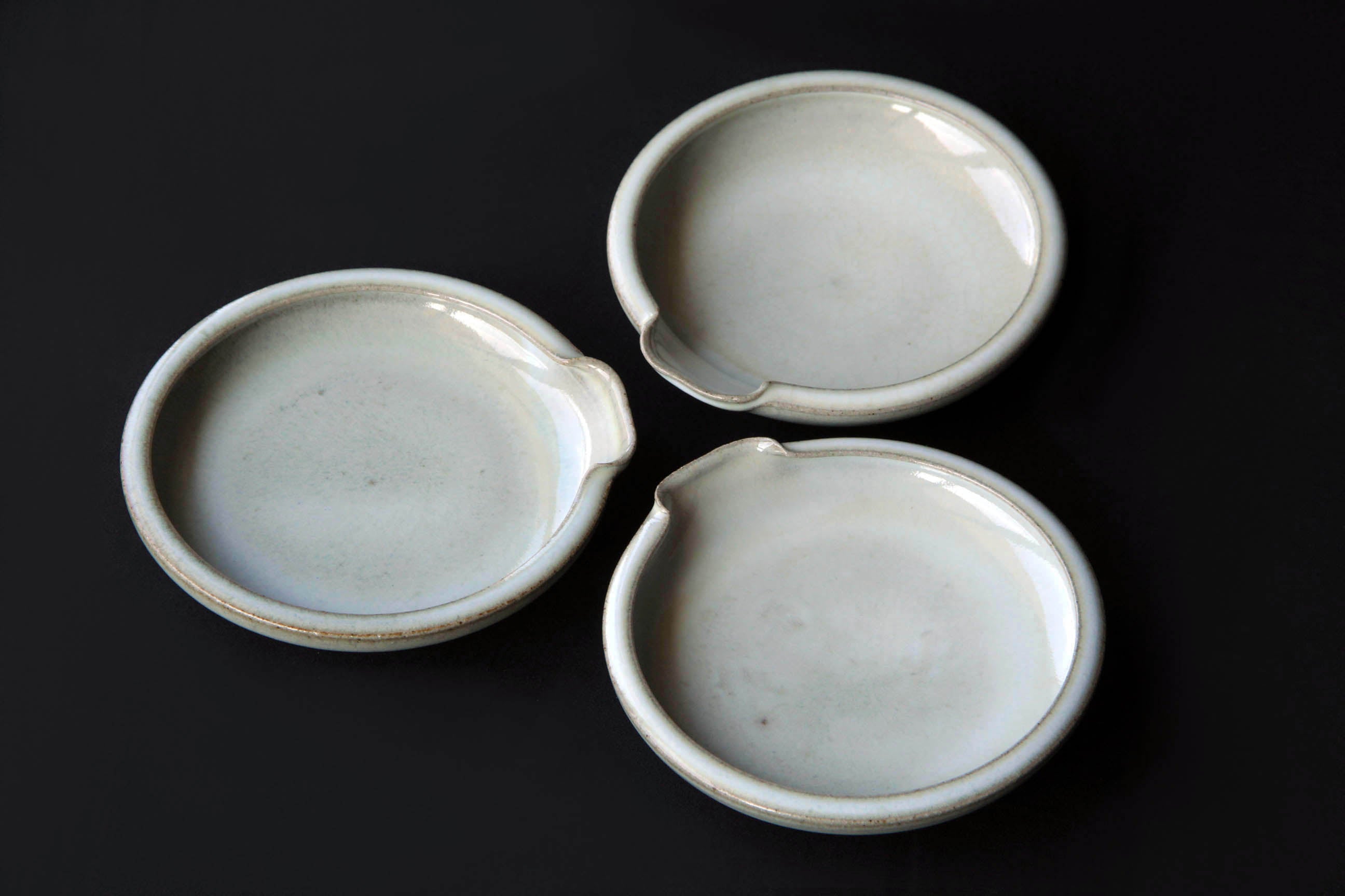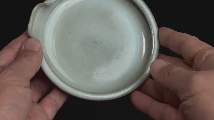 A small ceramic plate finished in a soft pale glaze with subtle tonal variation.