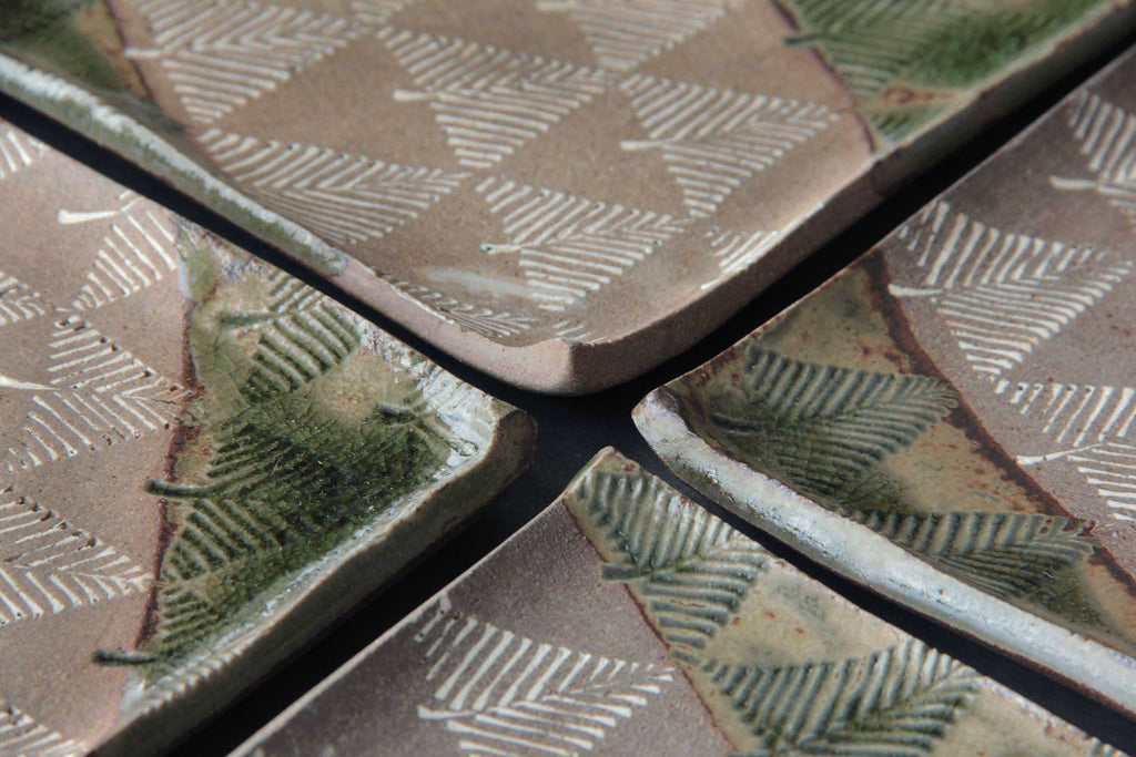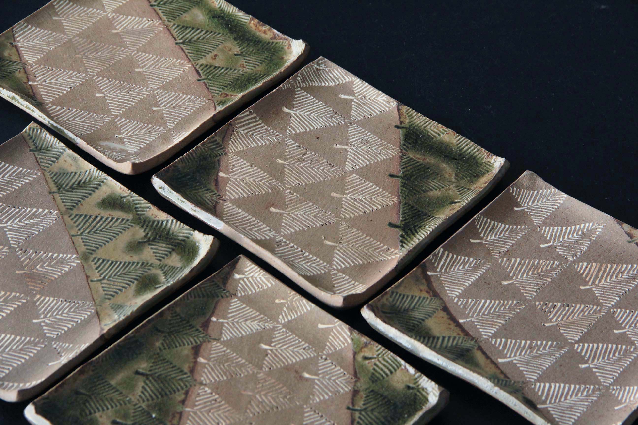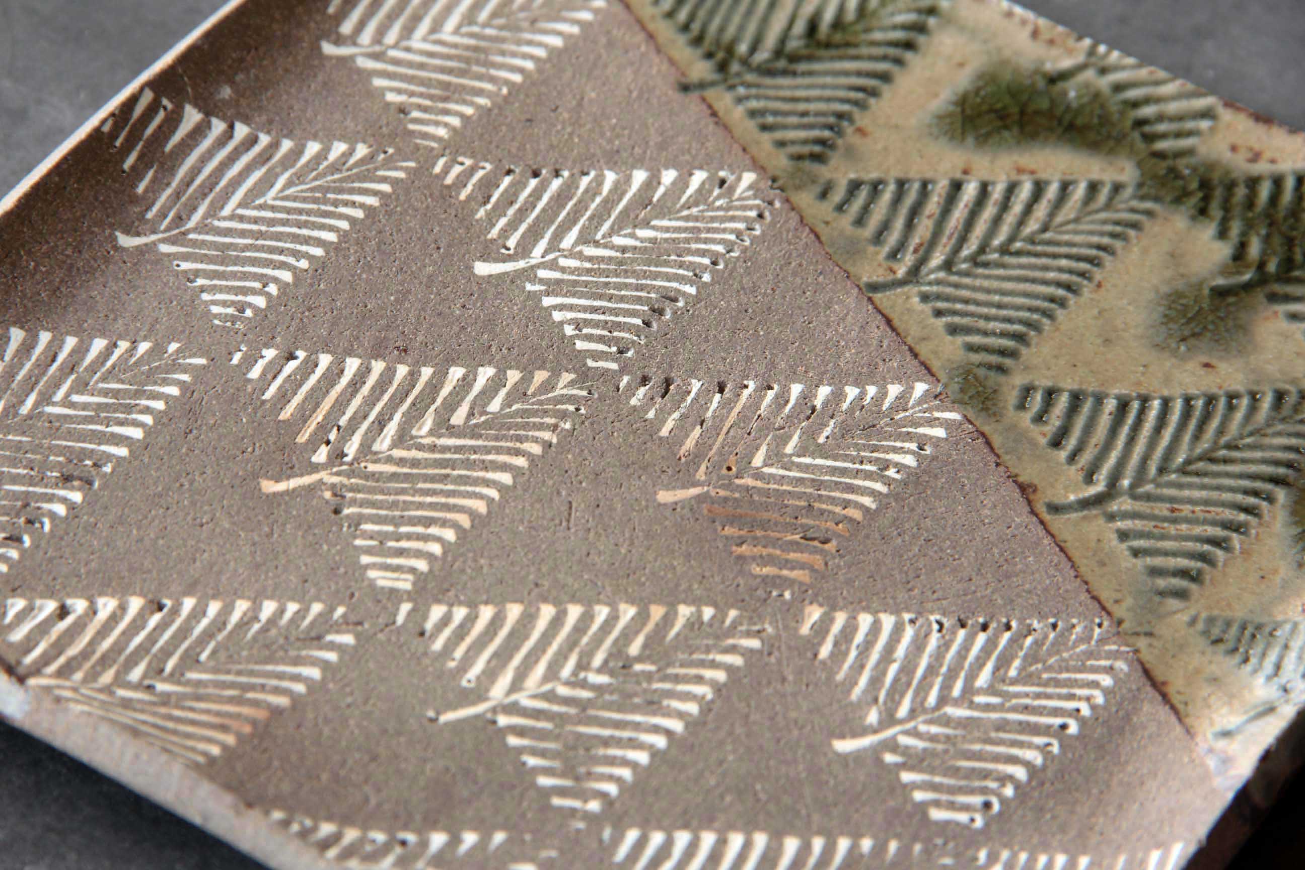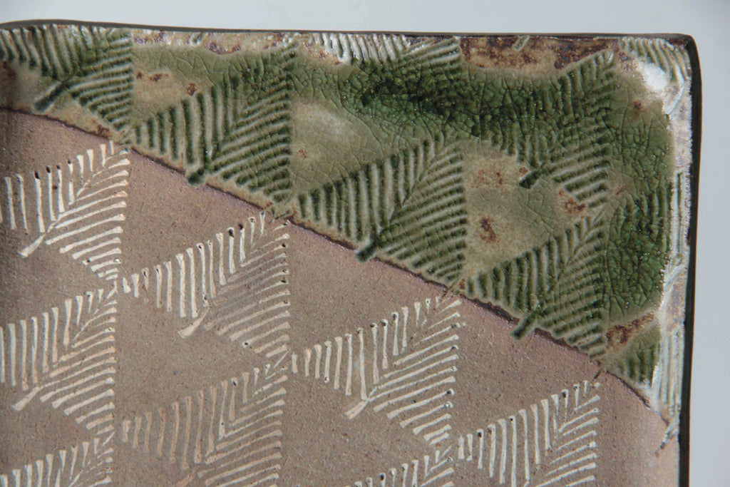 The surface is decorated with repeated triangular motifs created by fine incised lines, giving the piece a textured, rhythmic appearance.