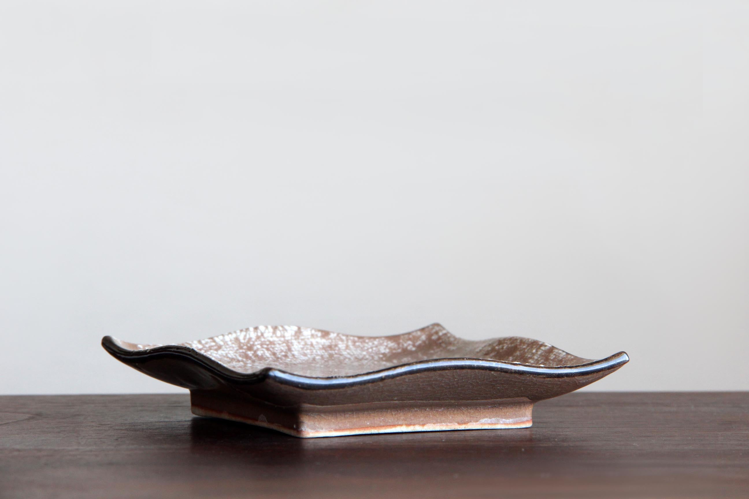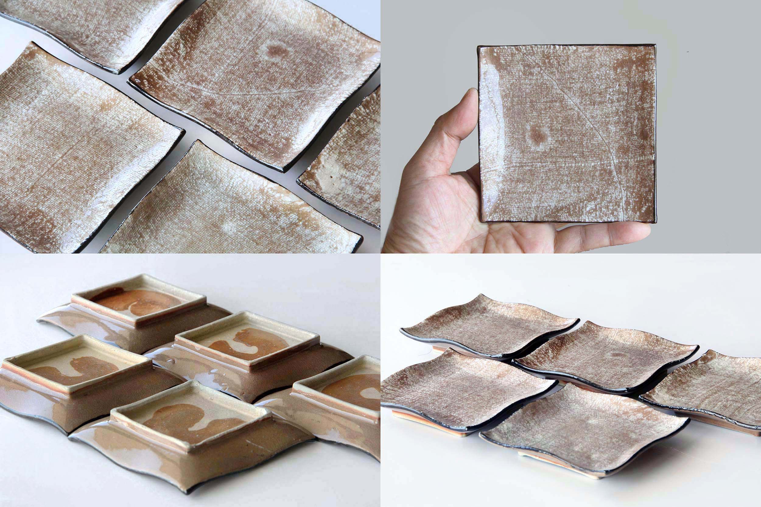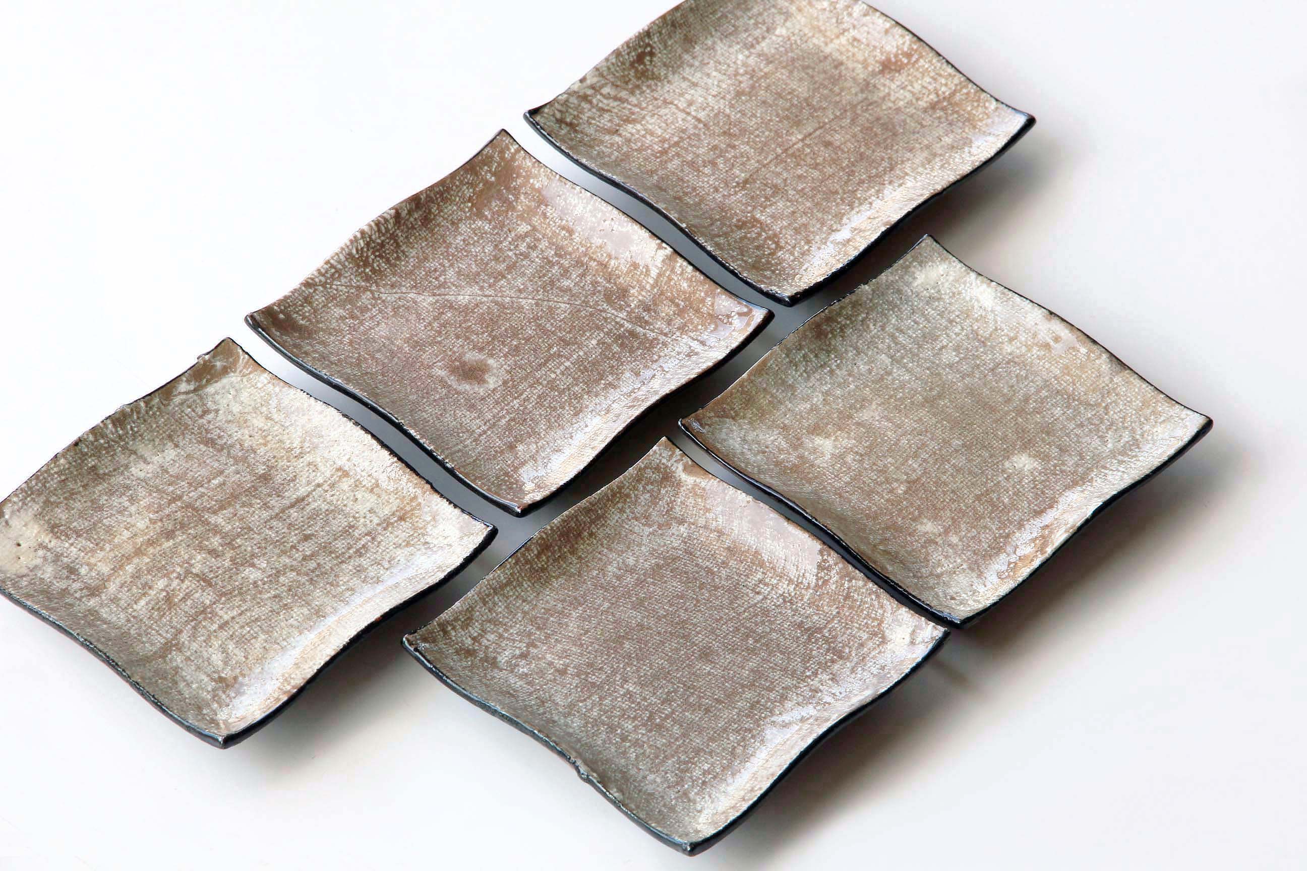 A vintage Japanese ceramic plate with a softly undulating square form and a woven-cloth-like pattern across the surface.
